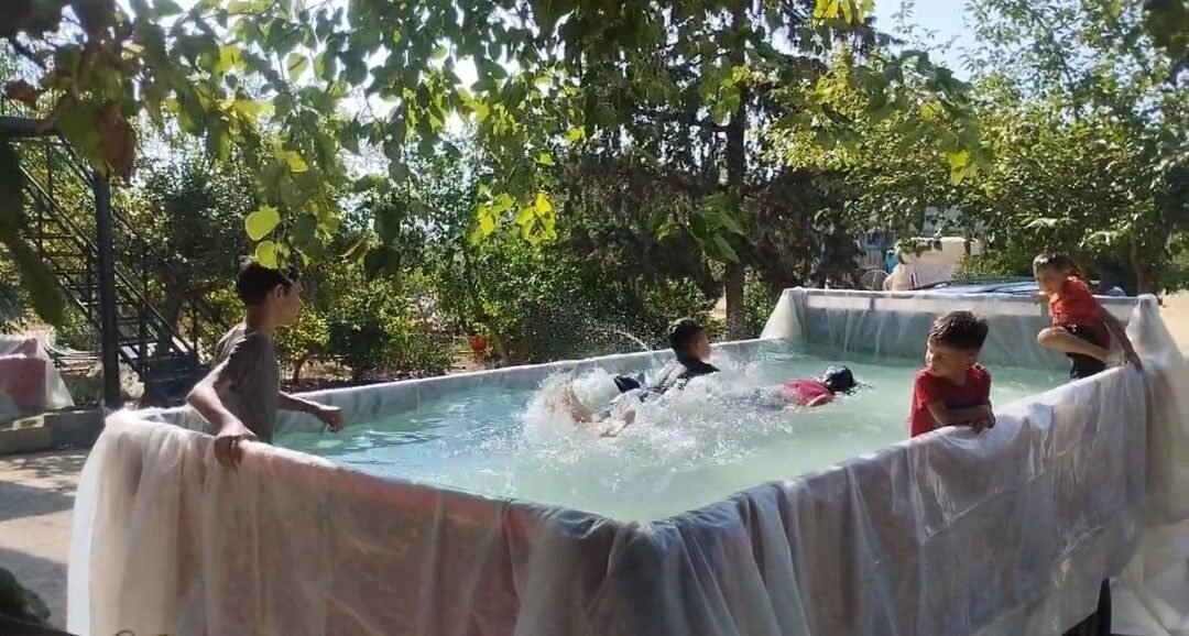 Baba Eroğlu, “Hava aşırı sıcak olduğu için deniz de çok sıcaktı. Bu nedenle çocuklar denize girmek istemedi. Ben de römorku havuza çevirdim. Çocuklar bu havuzda yüzüp serinliyor. Hava çok sıcak” dedi.