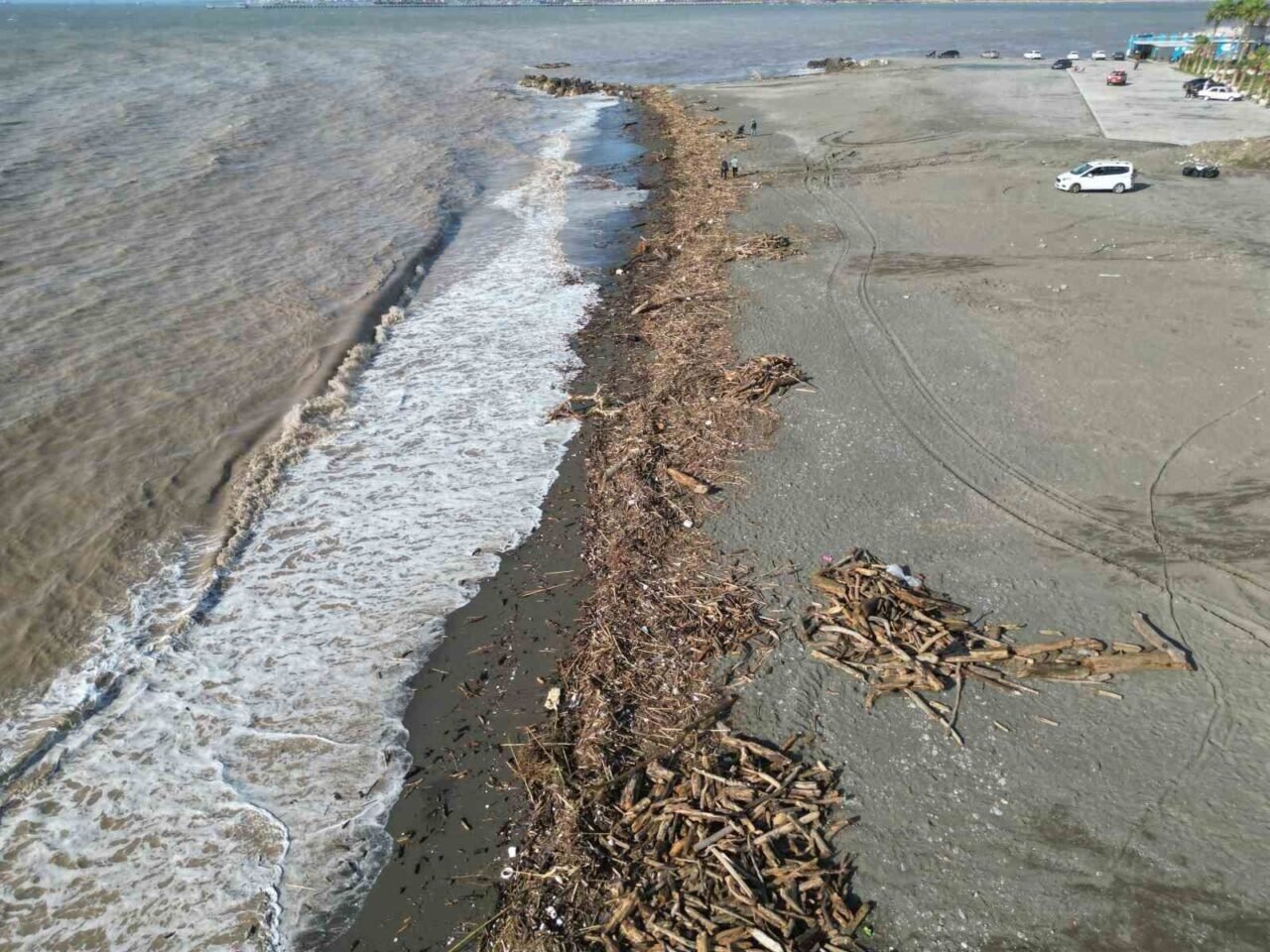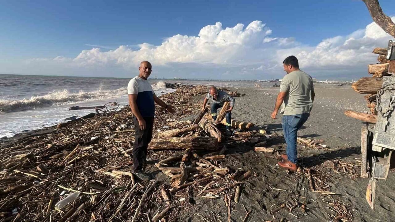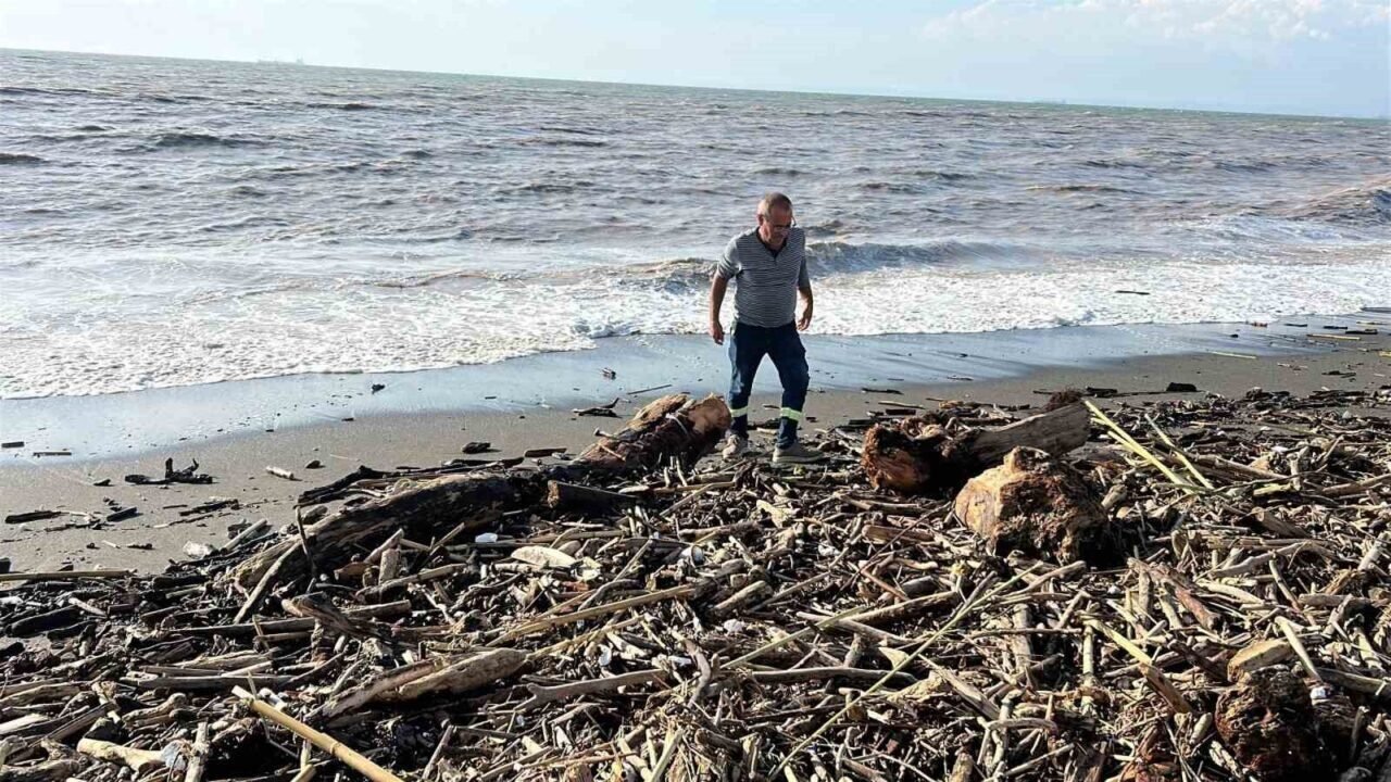 Şiddetli yağışla kahverengiye dönen Akdeniz’de kıyı kütüklerle kaplandı