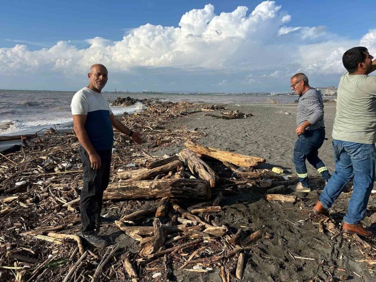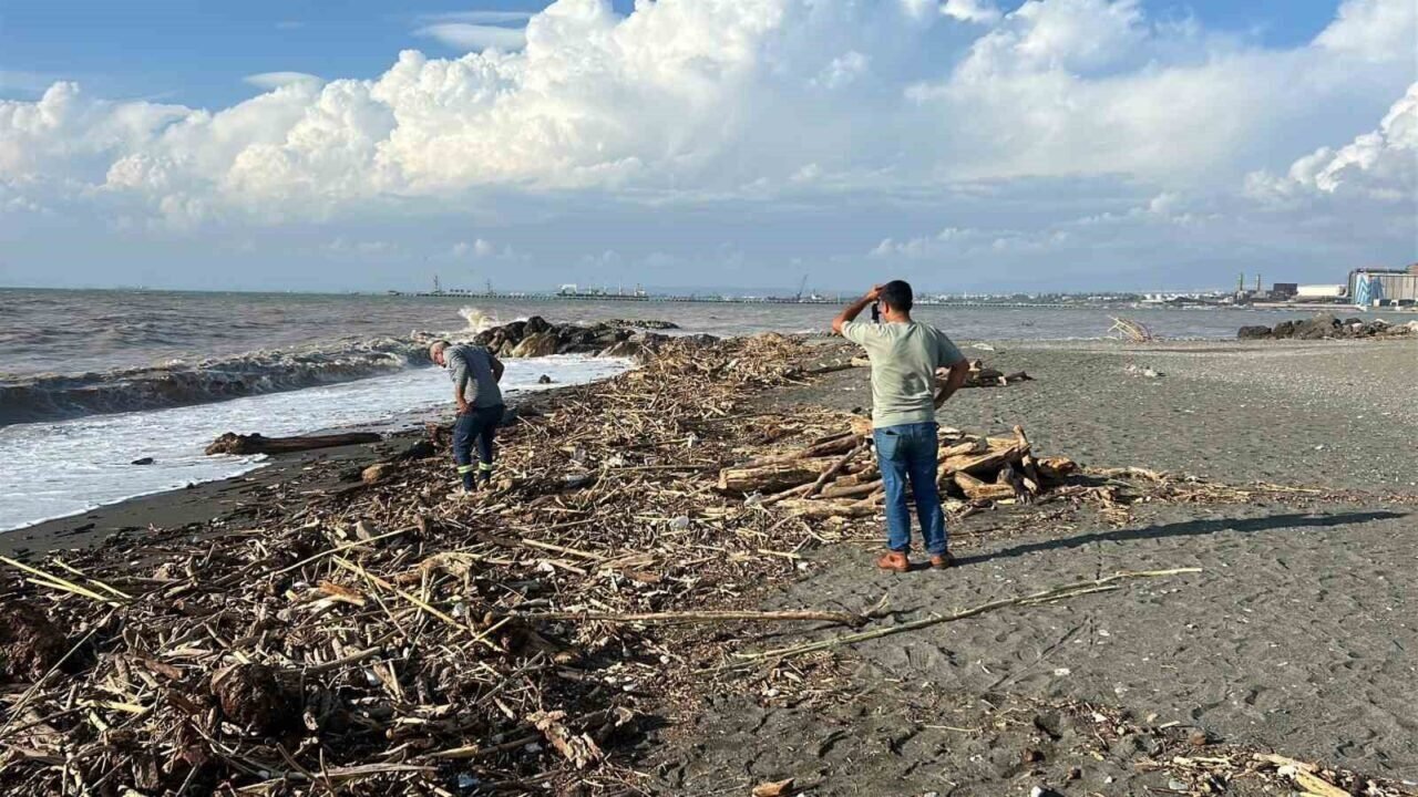 Hatay’ın kıyı ilçelerinde etkili olan şiddetli yağış Akdeniz’in kıyılarını kütüklerle kaplarken, denizin rengi kahverengiye döndü.