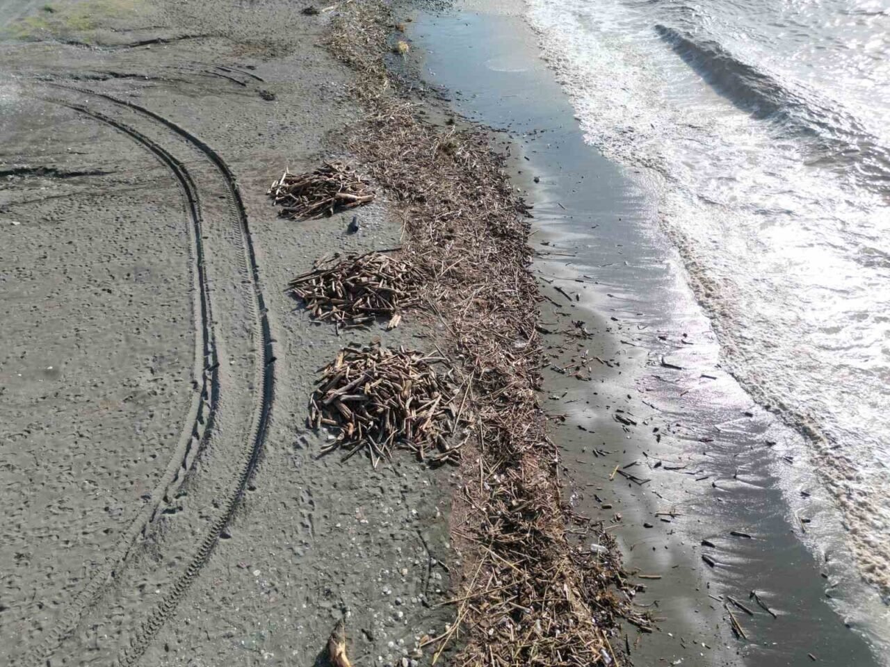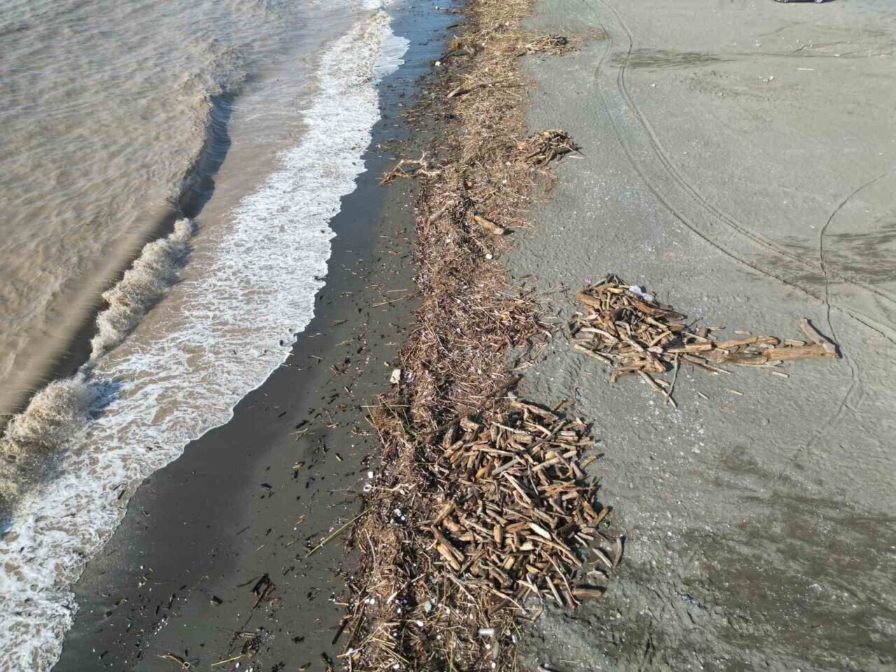 Meteoroloji Genel Müdürlüğü’nün şiddetli yağış uyarısında bulunduğu Hatay’da geçtiğimiz gün gece saatlerinde başlayan yağışlı hava etkisini sürdürüyor. Yoğun yağış nedeniyle ilçe genelinde caddeler ve sokaklar göle dönerken, derelerde debinin yükselmesi sonucu bazı bölgelerde sel meydana geldi. Şiddetli yağışın etkisiyle Akdeniz’in Payas kıyılarında sahil kütüklerle kaplanırken denizin rengi kahverengiye döndü. Sabah erken saatlerinde bölgeye giden vatandaşlar, kıyıya yığılan kütükleri topladılar. Öte yandan, sel sularının denize karışmasıyla oluşan manzara dron ile görüntülendi.