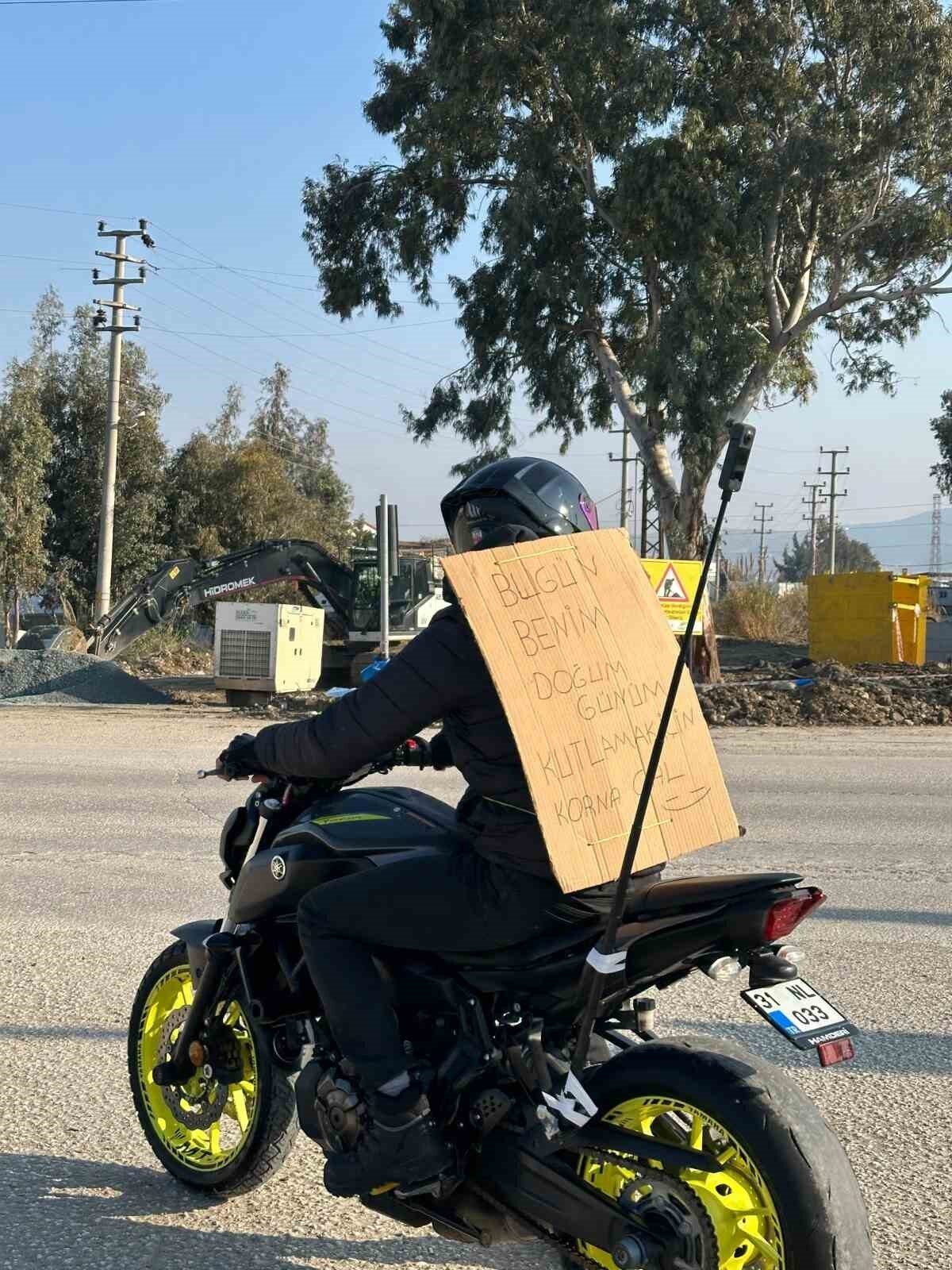 Hatay’da motosiklet tutkunu Ahmet Hamderi, 27’nci yaş gününü “Bugün benim doğum günüm, kutlamak istiyorsan korna çal” yazılı kartonla trafiğe çıkarak kutladı. Hamderi’nin trafikte insanların sempatik tavırlarıyla karşılaştığı anlar ilgi odağı oldu.