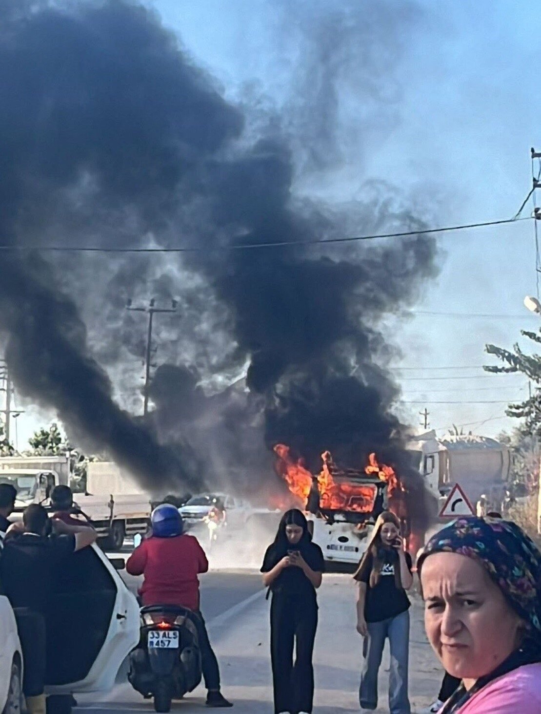 Mersin’in Erdemli ilçesinde yolcu taşıyan minibüs alev alev yandı. Sürücünün yolcuları hızla tahliye etmesi muhtemel facianın önüne geçti.
