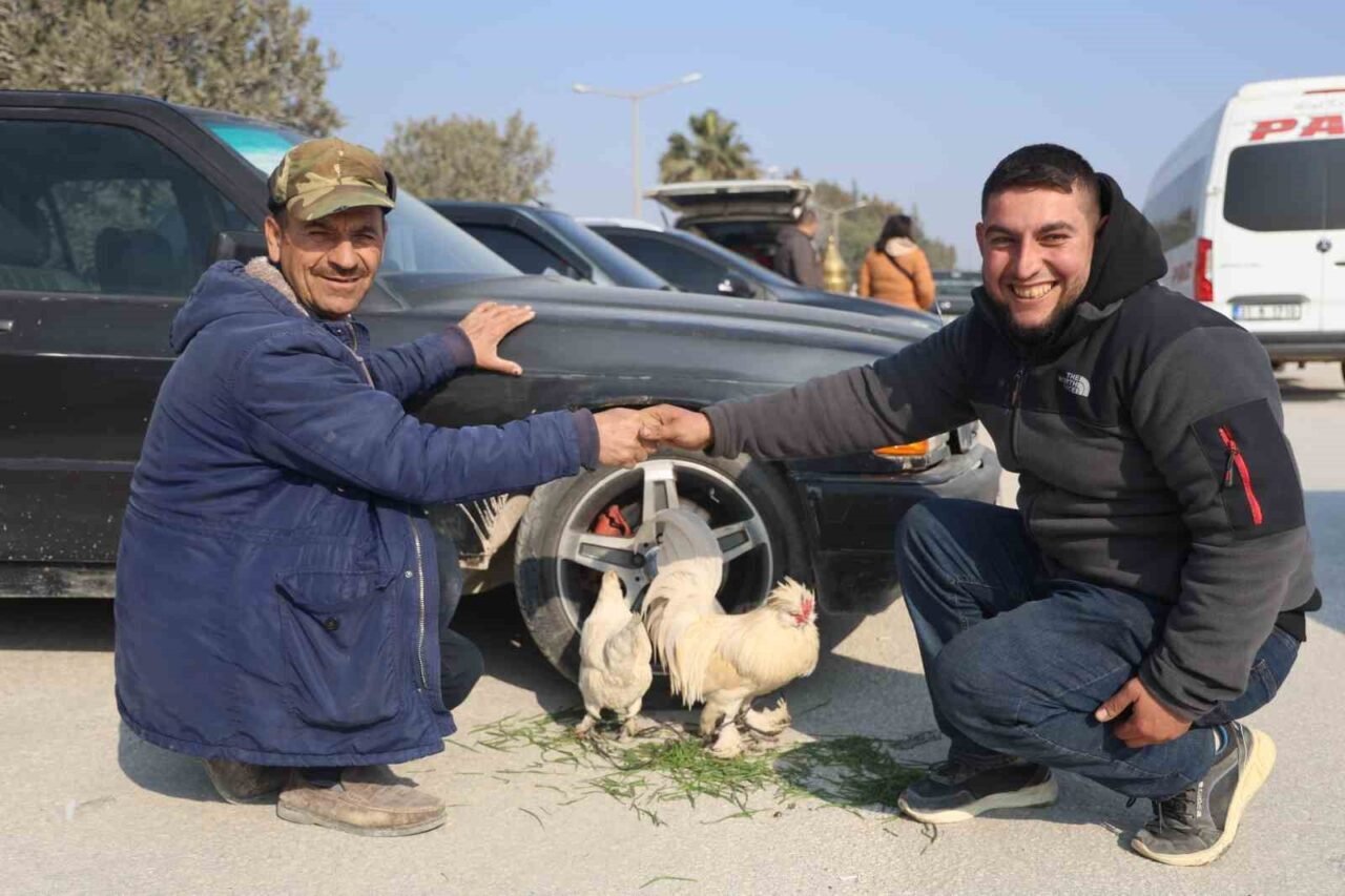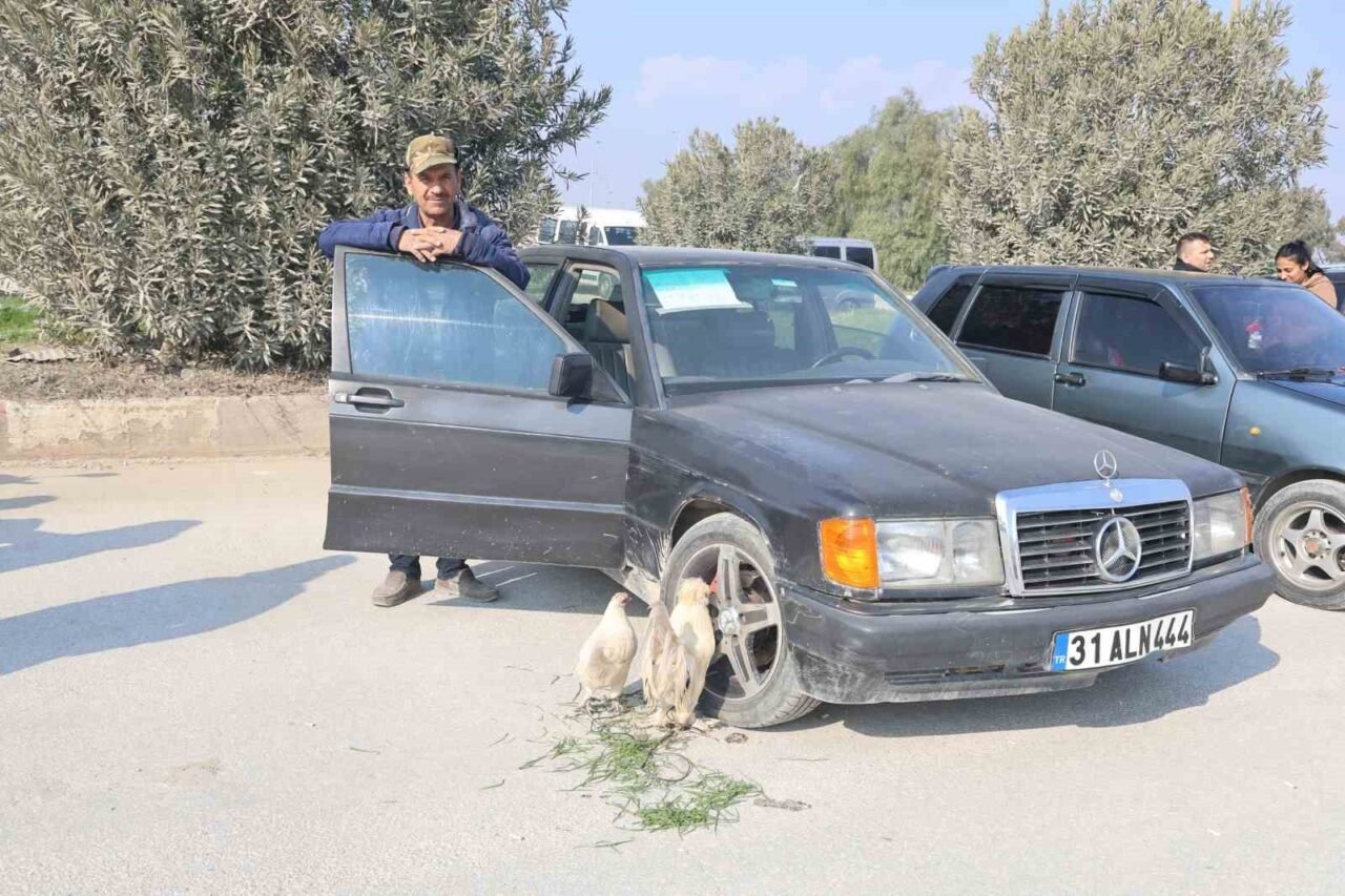 Hatay’da aracını satmak için araba pazarına getiren Mehmet Kuyucu, hobi olarak beslediği tavuğu ve horozunu da aracın tekerine bağlayarak aracıyla birlikte satışa çıkardı. Aracın tekerine bağlı hayvanlar görenlerin dikkatini çekerken Kuyucu, tavuk ile horoza 3 bin TL arabaya ise 260 bin TL’den müşteri bekledi.