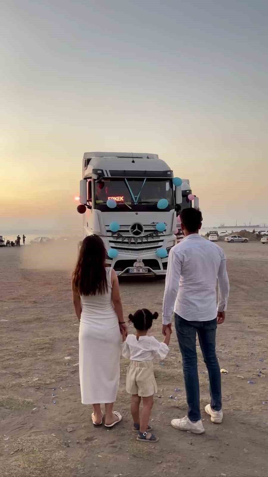 Hatay’da tır şoförlüğü yapan Caner Çevik, ikinci kez baba olmanın heyecanını farklı bir organizasyonla unutulmaz hale getirdi. Tır şoförünün meslektaşları, tırlarla parti düzenleyerek aileye evlatlarının cinsiyetini açıkladı.