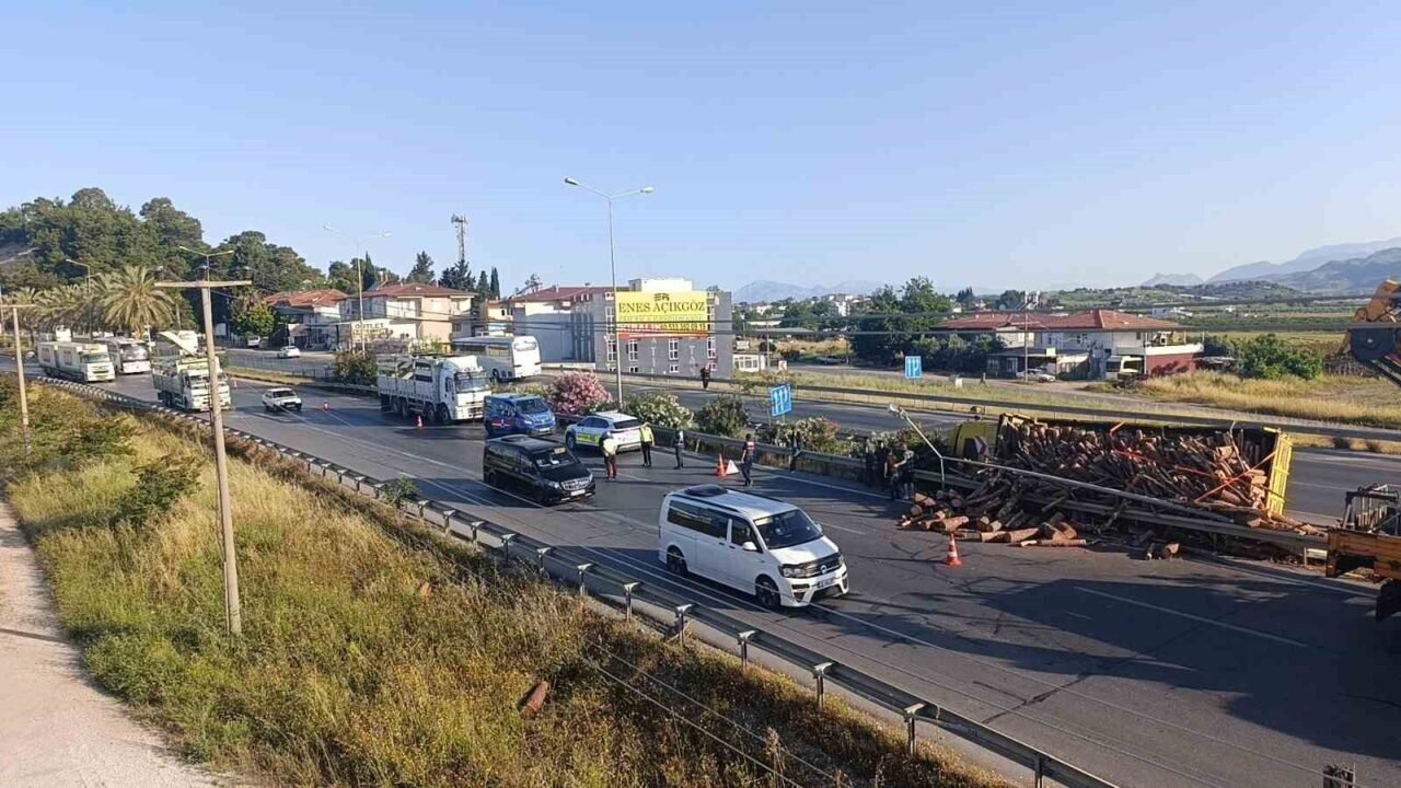 Antalya’nın Manavgat ilçesinde tomruk yüklü kamyonun bariyerleri aşıp refüje devrilmesi