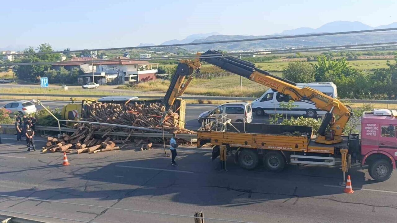 Antalya’nın Manavgat ilçesinde tomruk yüklü kamyonun bariyerleri aşıp refüje devrilmesi sonucu meydana gelen kazada şans eseri yaralanan olmadı.