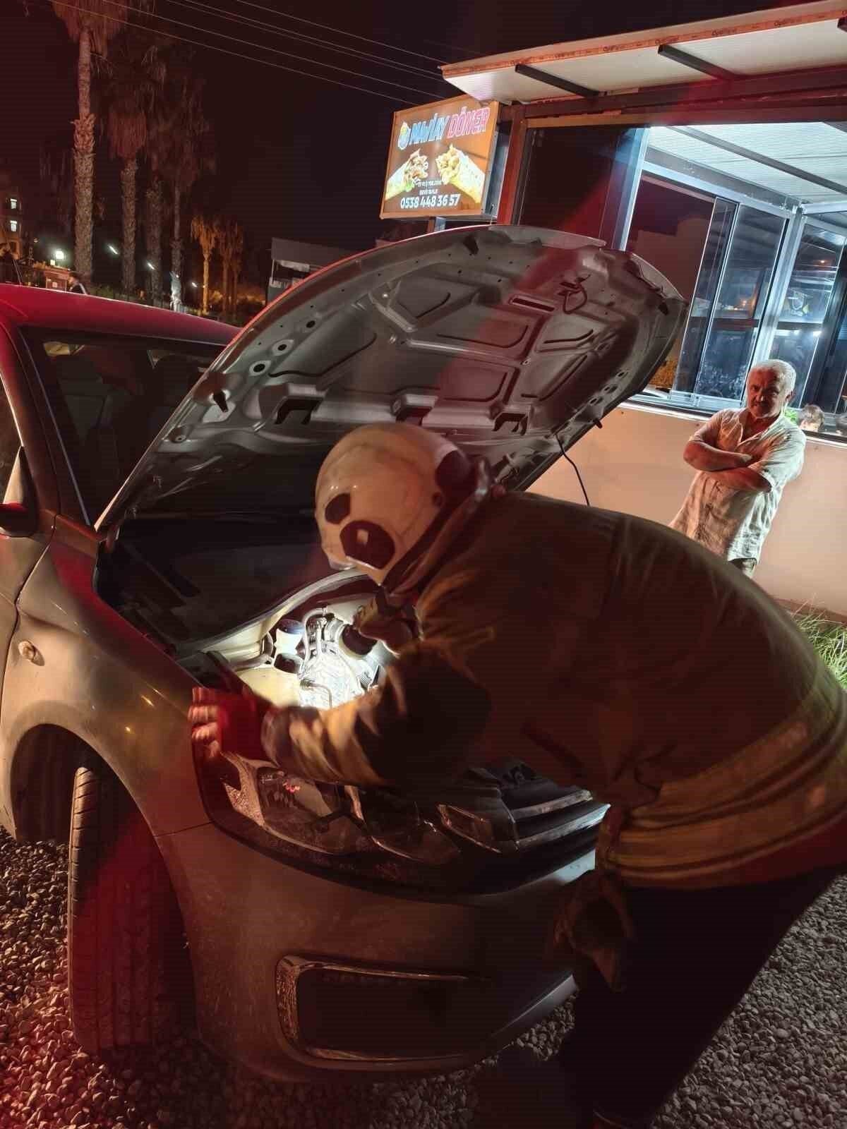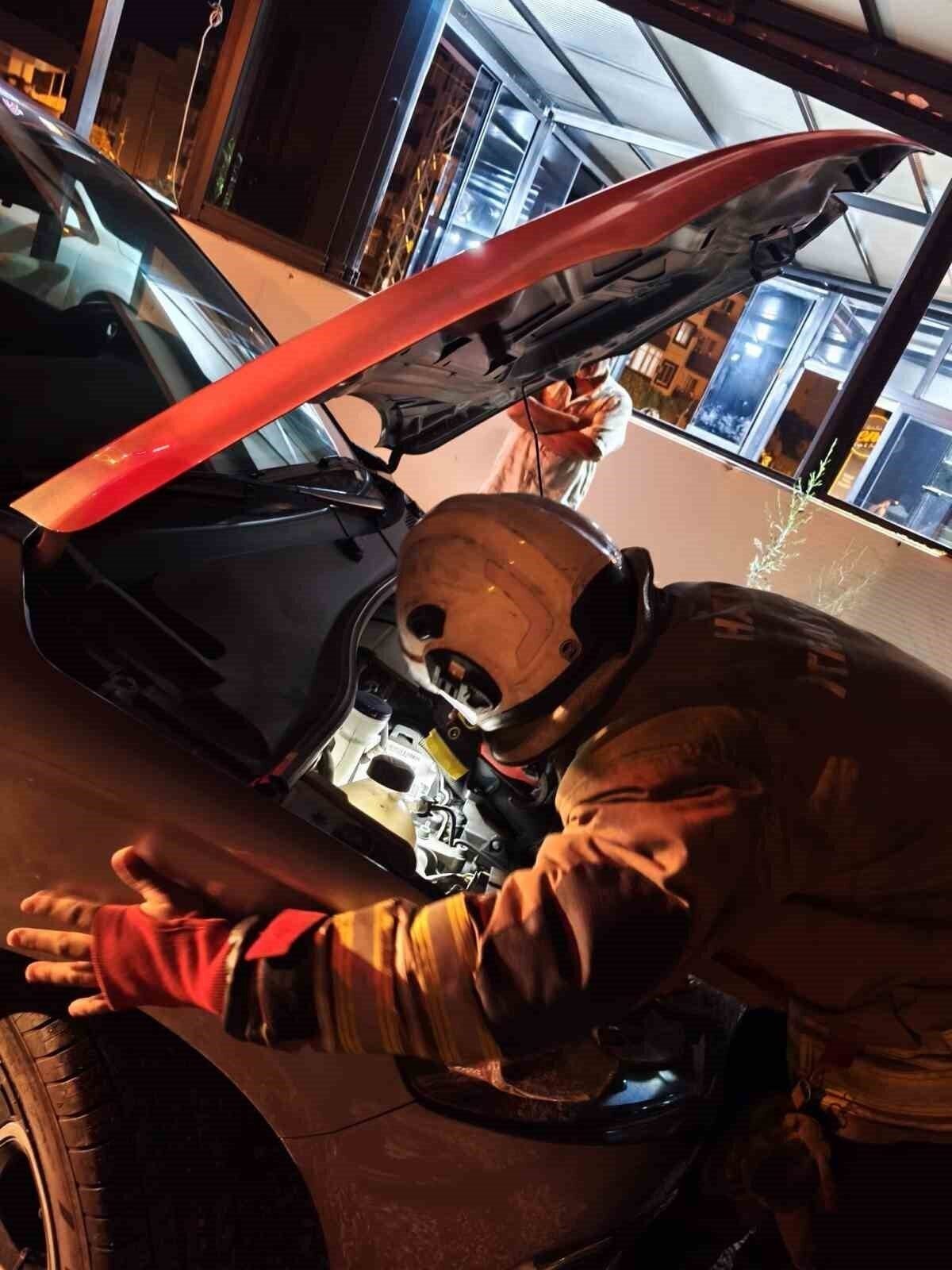 Hatay’da soğuk havada aracın motoruna sığınan yavru kedi, itfaiye ekiplerini ve araç sahibini dakikalarca uğraştırdıktan sonra kendiliğinden çıktı.