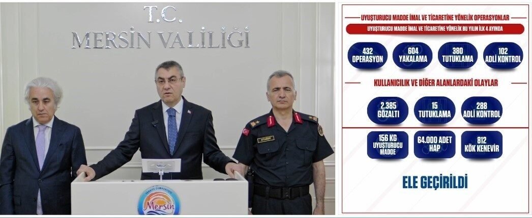 İnsanlığın en büyük düşmanı olarak gördükleri uyuşturucu ve madde bağımlılığıyla mücadeleye kararlılıkla devam ettiklerini vurgulayan Vali Toros, şöyle devam etti; “Başta gençlerimiz olmak üzere milletimizi zehirlemeye kalkanlara, asla geçit vermeyeceğiz. Güvenlik güçlerimizin başarılı çalışmaları sonucunda bu yılın ilk 4 ayında uyuşturucu imal ve ticaretine yönelik 432 operasyon düzenledik. Bu operasyonlarda yakaladığımız 604 şahıstan 380’i tutuklanıp cezaevine gönderilirken 102’si hakkında adli kontrol tedbiri uygulandı. Bunun yanında kullanıcılık ve diğer alanlardaki 2 bin 176 olayda gözaltına alınan 2 bin 385 şahıstan 15’i tutuklanırken, 288’ine adli kontrol tedbiri uygulandı. Bu operasyonlarda çeşitli türdeki 156 kilogram uyuşturucu madde, 64 bin uyuşturucu hap, 812 kök kenevir ele geçirildi. Yılın ilk 4 aylık verilerini kapsaması nedeniyle bu rakamlara dahil edilmeyen ve İçişleri Bakanımızın da sosyal medya hesabından duyurduğu üzere 3 gün önce, emniyetimiz tarafından 28 kilogram kokain ve jandarmamız tarafından 680 litre sıvı metamfetamin ele geçirilmiştir. Bu da zehir tacirlerine geçit vermeyeceğimizin açık bir göstergesidir. Yine 1 Mayıs tarihinde İçişleri Bakanımızın açıkladığı üzere, jandarmamızın 3 aylık titiz çalışmaları neticesinde faaliyetleri tek tek delillendirilen, torbacı diye tabir edilen 112 sokak satıcısı Narkokapan-Mersin operasyonuyla kıskıvrak yakalandı. Bu operasyonlarla gençlerimizin hayatını çalmaya cüret eden zehir tacirlerine, girdikleri sokağın çıkmaz sokak olduğunu ve gençlerimize dokunmaya kalkışanlara hesabını hukuk önünde ödeteceğimizi net bir şekilde gösterdik. Uyuşturucu satıcılarının ensesindeyiz, bu illeti Mersin sokaklarından söküp atacağız.”