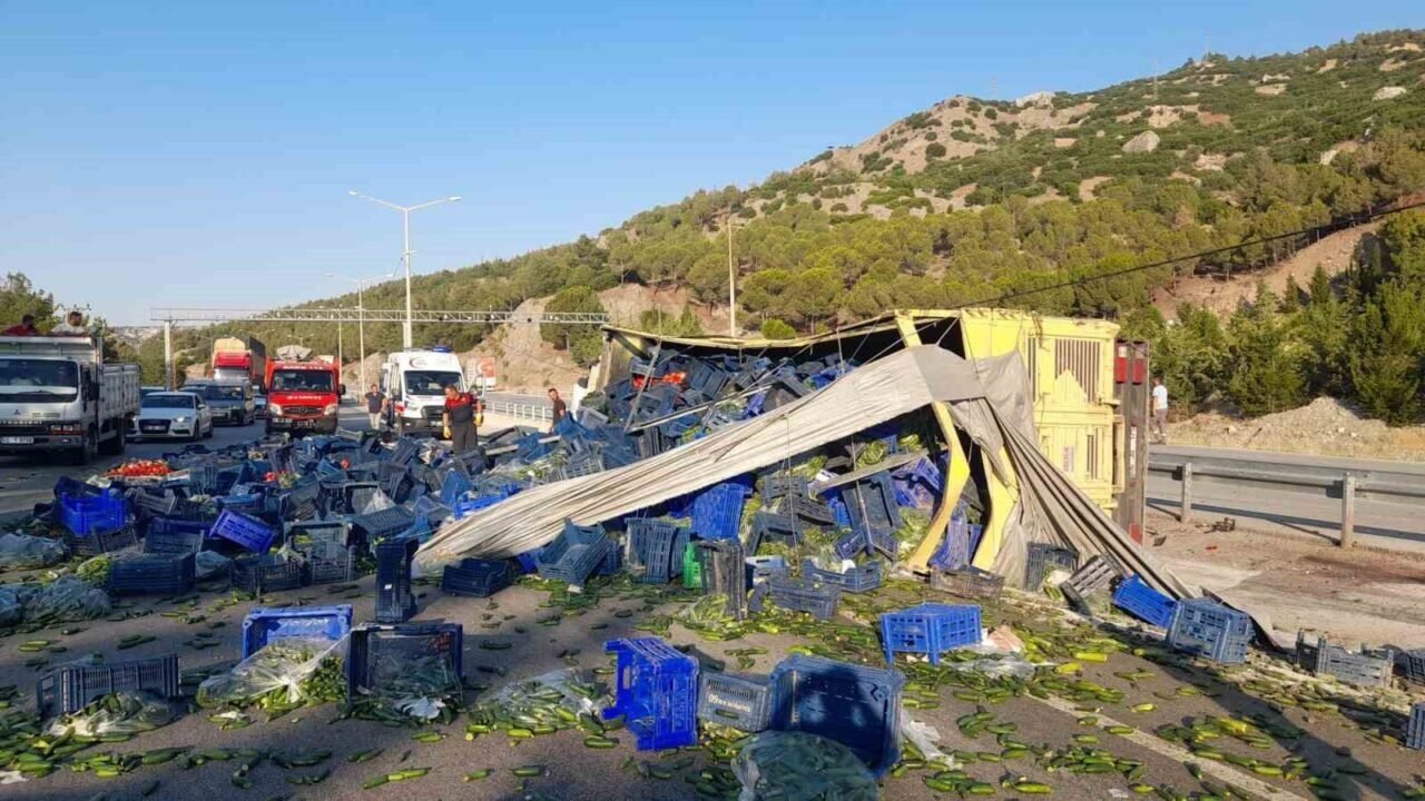 Virajı alamayan sebze yüklü kamyon refüje devrildi: 1 yaralı