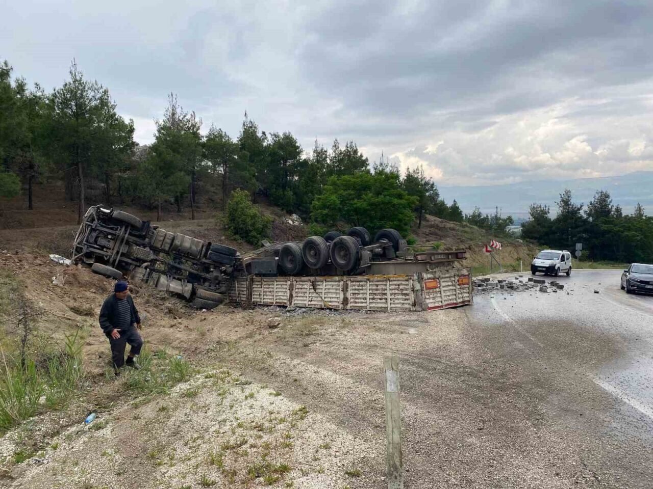 Yağışlı hava kazayı beraberinde getirdi, tuğla yüklü tır şarampole devrildi