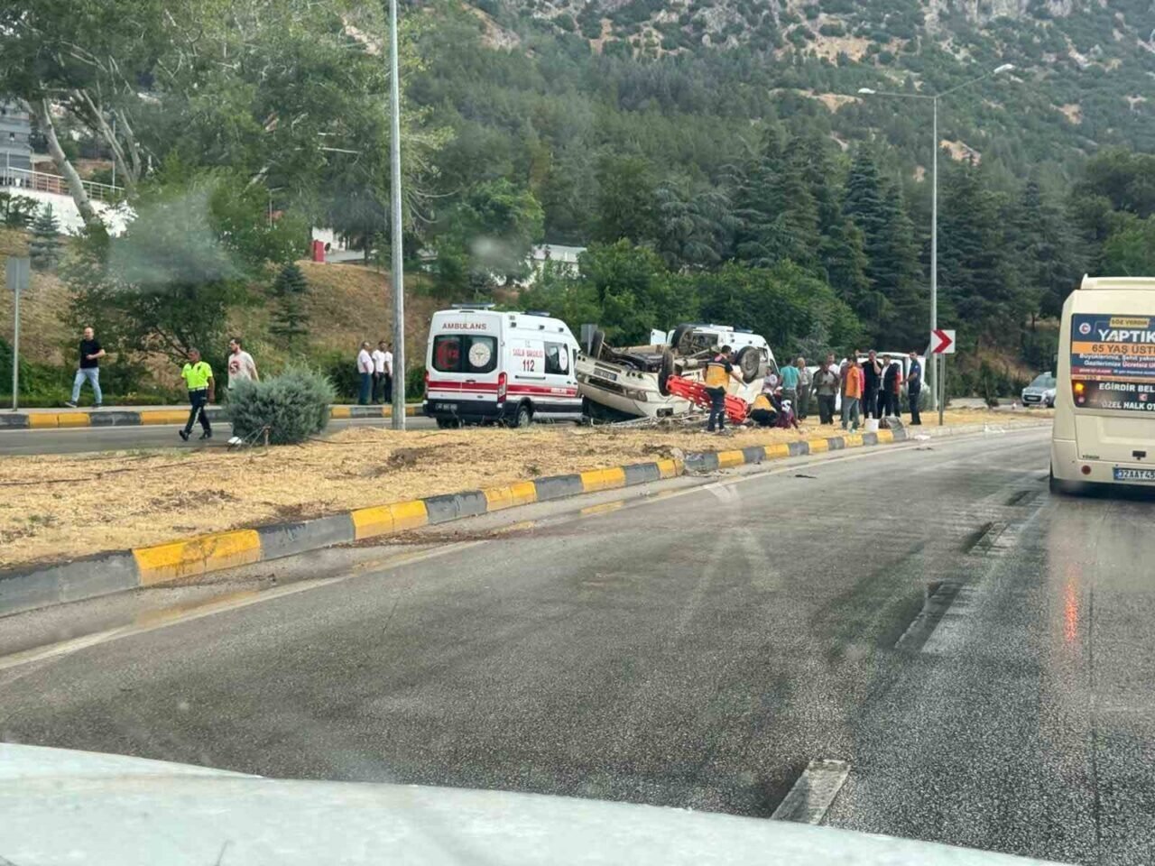 Kaza, bugün saat 14.30 sıralarında Isparta Eğirdir-Konya Karayolu üzerindeki Kemik Eklem Hastalıkları Tedavi ve Rehabilitasyon Hastanesi önünde meydana geldi. Edinilen bilgilere göre, İsmail Ç. idaresindeki 63 AED 388 plakalı minibüs, yağış nedeniyle kayganlaşan yolda sürücüsünün kontrolünden çıkarak önce refüje çarptı ve ardından takla attı. Çarpmanın etkisiyle araç ters dönerken, sürücü İsmail Ç. ile araçta yolcu olarak bulunan Rabia D., Ayşe Gül K., Tahir D., Yıldız Ç., Hatice Ç., Nuri Ç., Elif Ç. ve Esma Nur Ç. yaralandı. Kazayı gören vatandaşların ihbarı üzerine olay yerine sağlık, itfaiye ve polis ekipleri sevk edildi. Olay yerinde yapılan ilk müdahalenin ardından yaralılar ambulanslarla Eğirdir ve Isparta’daki hastanelere kaldırıldı. Yaralılardan Rabia D.’nin sağlık durumunun ağır olduğu ve Isparta Şehir Hastanesi’ne sevk edildiği öğrenildi. Kazayla ilgili inceleme başlatıldı.