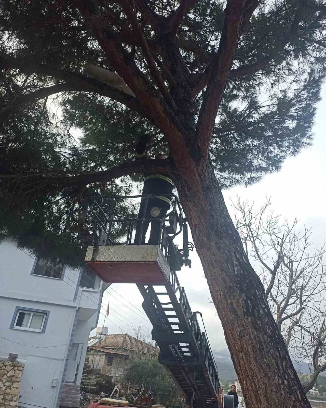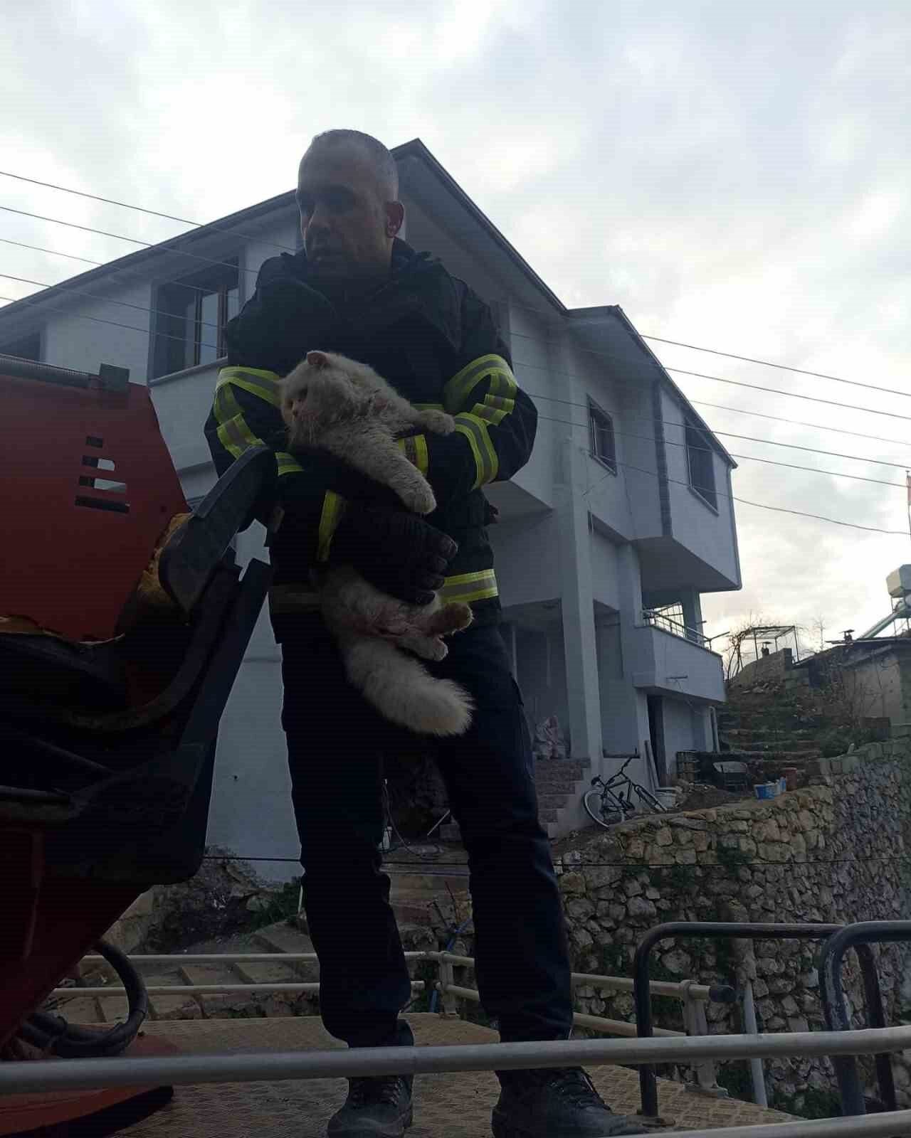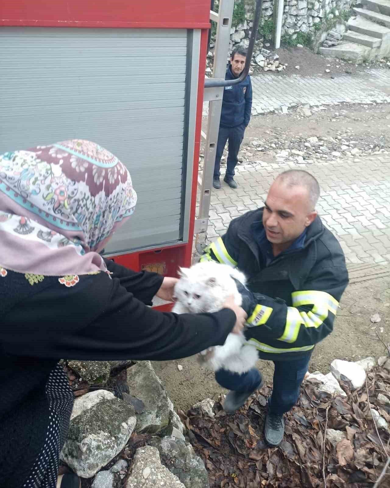 Hatay’da ağaçta mahsur kalan kedi itfaiye ekipleri tarafından merdivenle kurtarıldı.