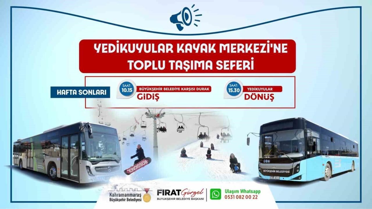 Kahramanmaraş Büyükşehir Belediyesi, hafta sonları Yedikuyular Kayak Merkezi’ne ulaşım için toplu taşıma seferleri düzenleyecek. Saat 10.15’te Büyükşehir Belediyesi karşısındaki otobüs durağından hareket edecek otobüsler, 15.30’da ise Yedikuyular’dan dönüş yapacak.