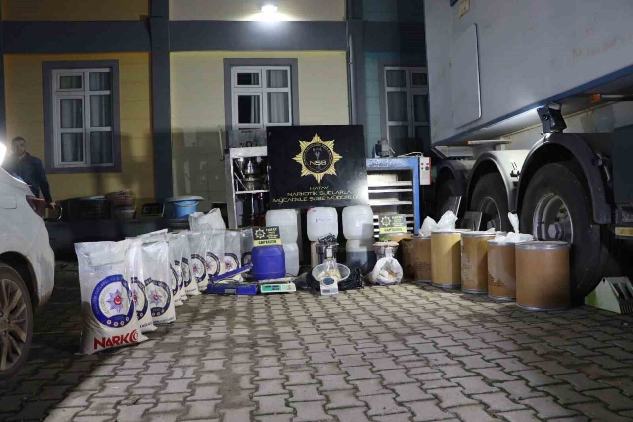 Hatay Emniyet Müdürlüğü, uyuşturucu imal ve ticaretine yönelik çalışmalarını aralıksız sürdüryor. Yapılan çalışmalar kapsamında; 28 Aralık günü 7 ayrı adrese operasyon düzenlendi. Operasyonda; M.E., M.İ., H.A., M.T., A.İ. ve Ö.E. isimli şahıslar, TCK 188 uyuşturucu madde imalat ve ticareti suçundan yakalanarak gözaltına alındı. Toplamda 7 adreste yapılan aramada Kumlu ilçesinde bir ahırın uyuşturucu üretim merkezi olarak kullanıldığı tespit edildi. Polis ekipleri tarafından 97 kilo 55 gram toz amfetamin, 70 kilo 85 gram asit, 27 kilo 75 gram alkol, 3 kilo 750 gram aseton, 95 kilo 815 gram uyuşturucu yapımında kullanılan toz ham madde, 38 bin adet captagon, 1 captagon üretim fırını, 1 captagon basım makinesi, 1 mazot tankı, 2 captagon öğütücü, 1 captagon paketleme makinesi, 2 terazi, 2 ruhsatsız tabanca ve 45 mermi, çok sayıda çeşitli uyuşturucu üretiminde kullanılan plastik ve metal kap ve malzeme ele geçirildi.