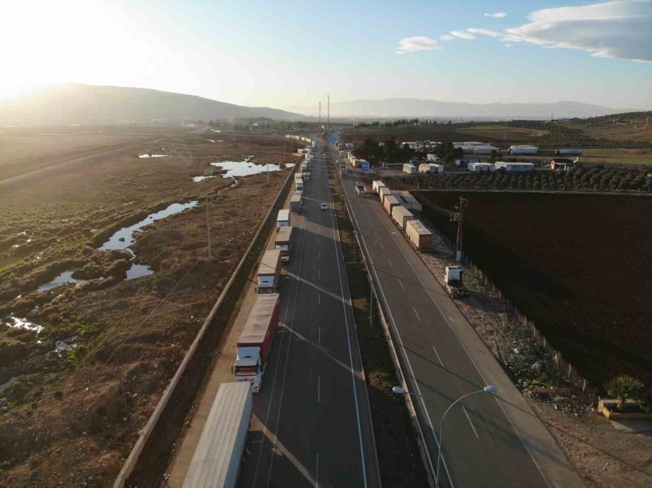 SURİYE’YE GEÇMEK İÇİN GÜNLERDİR BEKLEYEN TIRLARIN KİLOMETRELERCE KUYRUK OLUŞTURDUĞU ANLAR DRONE GÖRÜNTÜLENDİ.
